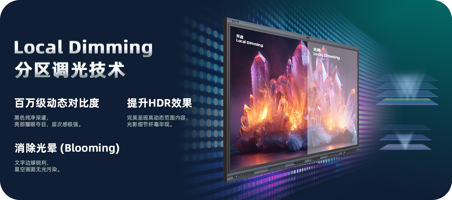 Local dimming: LEDs are arranged in an array and grouped into a certain number of areas. Local dimming technology is used to control each small LED block separately, and the backlight is fine tuned in multiple areas to enhance the display effect. It can provide higher brightness, higher contrast, more accurate color reproduction, and deeper black performance, effectively improving the problems of traditional LCD displays such as blackening in dark scenes, whitening in bright scenes, and overexposure in local areas.